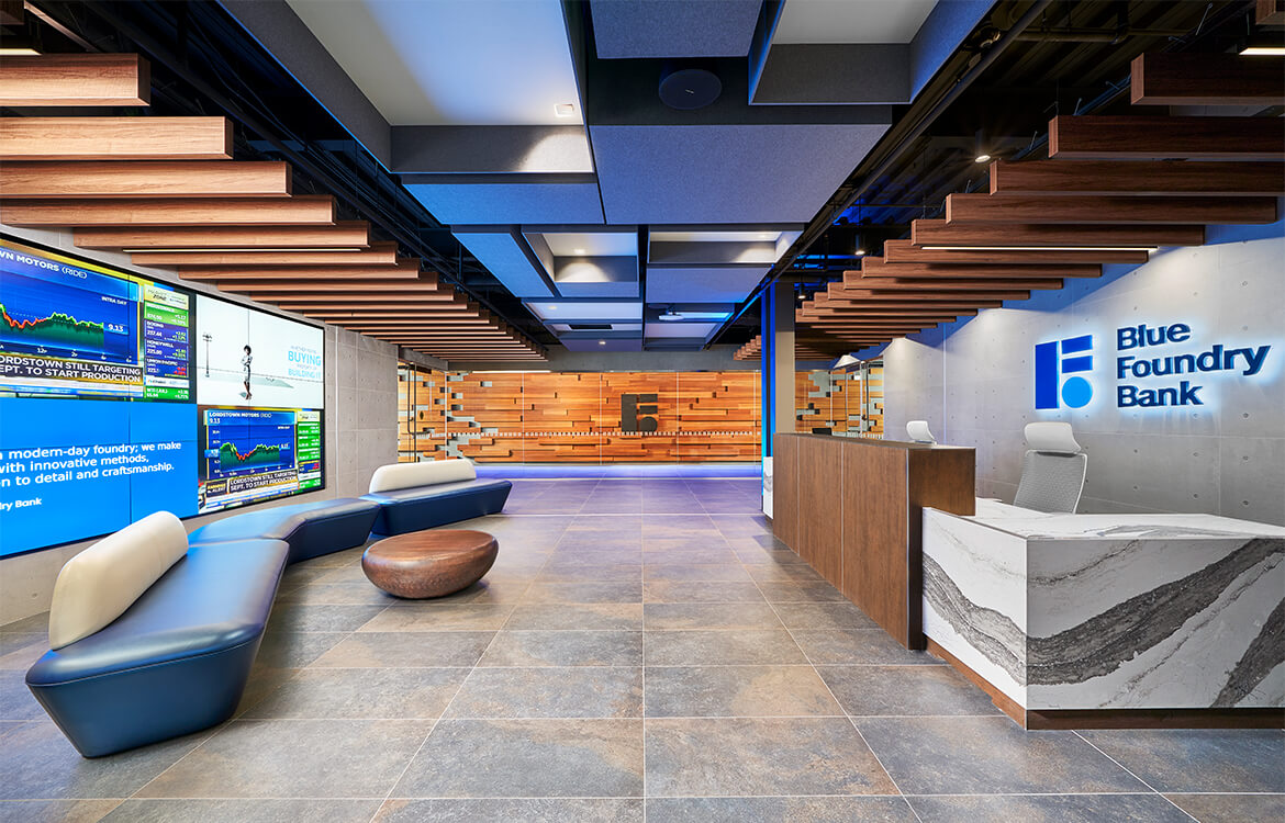 Blue Foundry Bank tasked DMR with designing their administrative office as the physical embodiment of the bank’s branding and business plan that encourages personal relationships and visionary ideas.