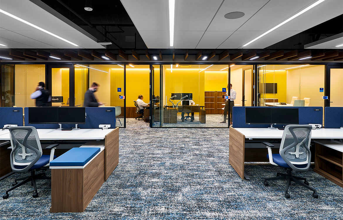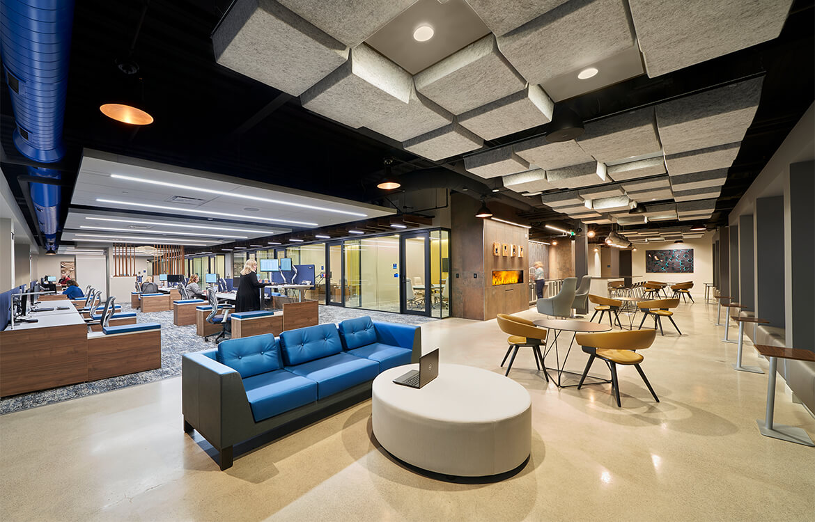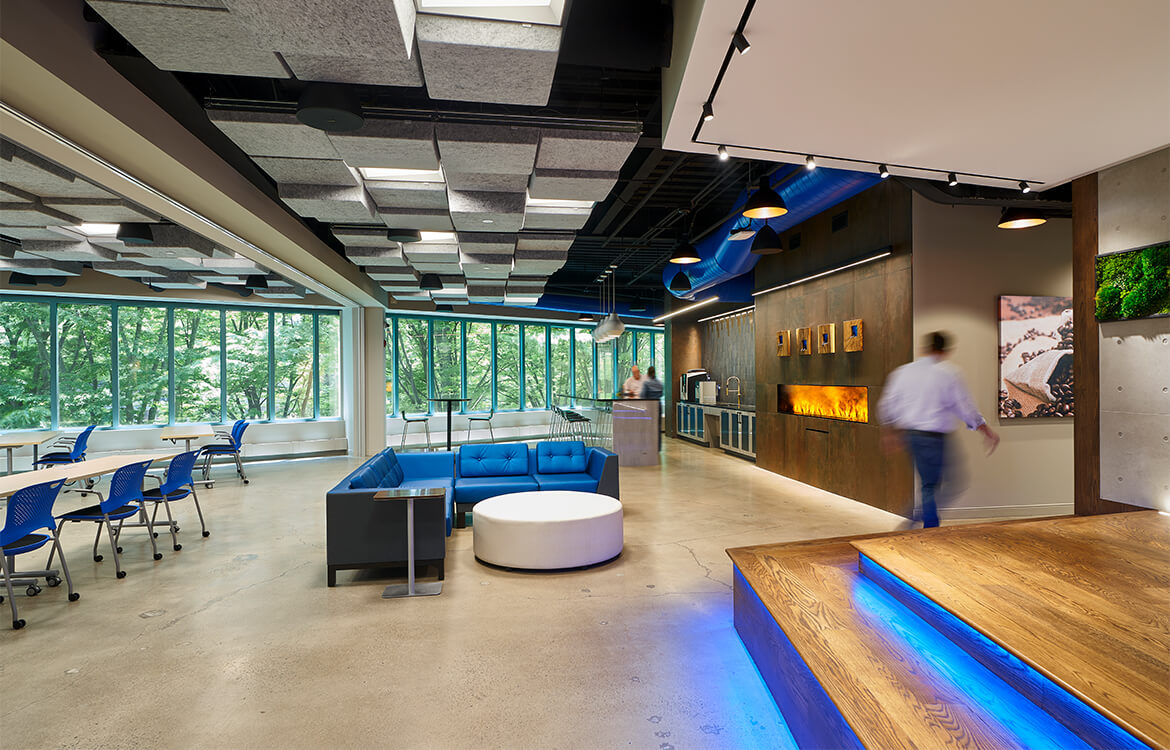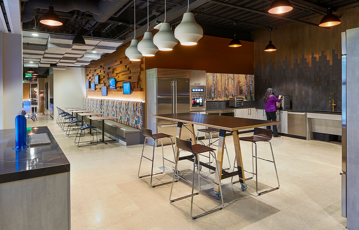Impressive design elements were utilized through program, finishes, furniture, and layout such as 14 different ceiling types; non-assigned reservable stations with sit/stand desks; and a reduced number of private offices, with those offices more toward the center. Unusual amenities also include a wellness room, lounges with fire features, and a cafeteria with dispensers for wine, beer and kombucha.