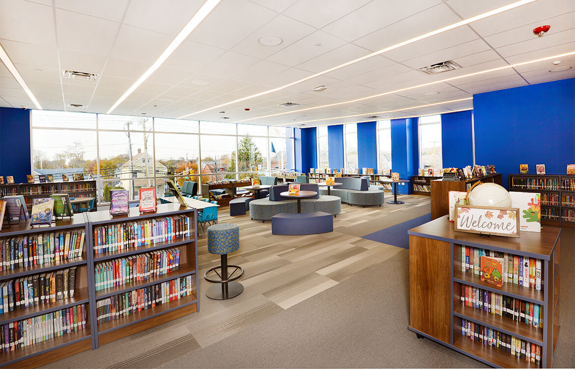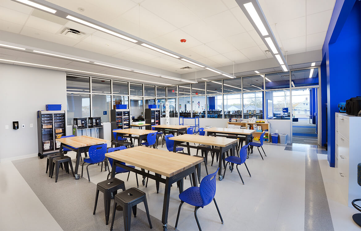 In addition to also offering an expanded cafeteria, science demonstration labs and improved traditional educational spaces, a centerpiece of the facility is the media center. The 3,000 SF space, featuring wraparound, floor-to-ceiling windows, provides a stimulating space for STEAM education adaptable for students as young as Kindergarten to middle-schoolers tackling advanced classes. Bookshelves are incorporated into the backs of seating and a classroom offers electronic whiteboards for small-group instruction.  An adjacent makerspace is enclosed in glass and is filled with virtual reality tech and 3D printers.