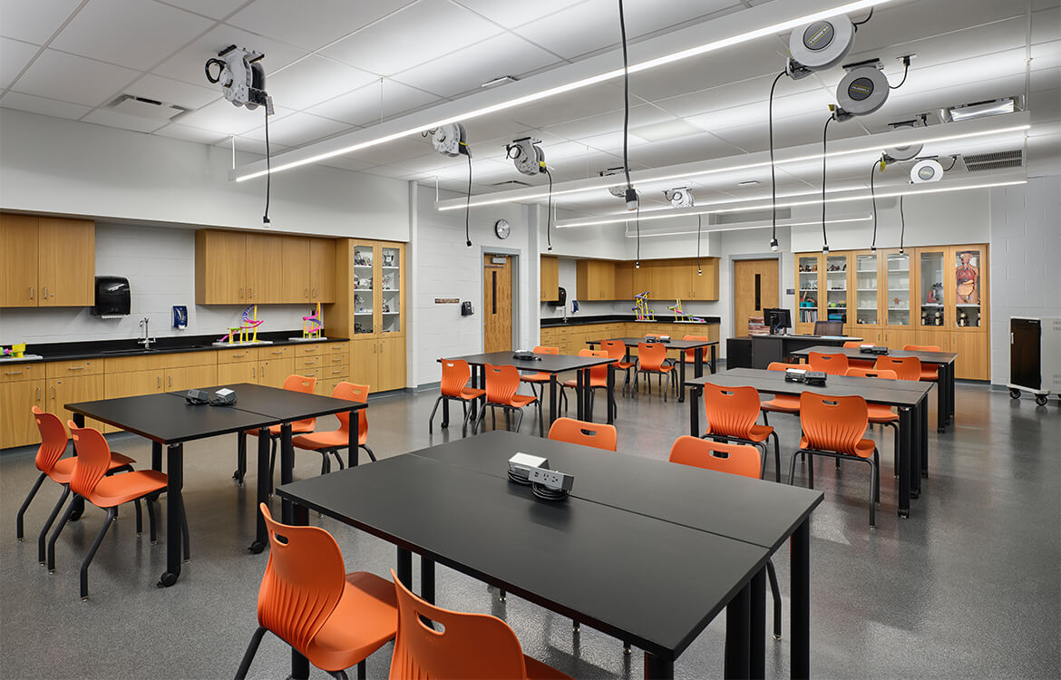 DMR first came on board when the district, facing overcrowding, was considering the construction of a new junior high. When their chosen site proved to be prohibitive for construction, the district turned to DMR to help find a more suitable home. Space was found at the existing high school. DMR determined that a facility that addressed site restraints, including flooding concerns, and met programming needs was feasible. DMR also proposed connecting the new facility to the high school by pedestrian bridge, allowing for a reduction in programming space through the use of shared spaces between the two schools.