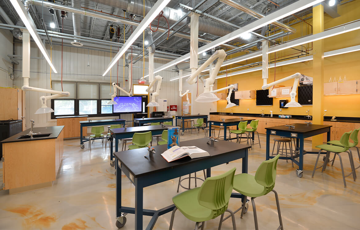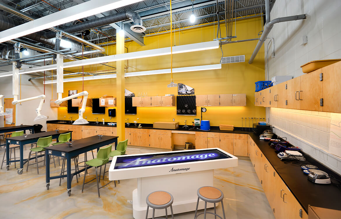 In the biomedical lab, DMR renovated a former music room in order to accommodate the biomedical science program. DMR’s design called for taking down the ceiling and hanging utilities and ventilation hoods from the new open ceiling, not only allowing for lab tables to move freely, but also freeing up space for an anatomage table, a highly sophisticated technology.