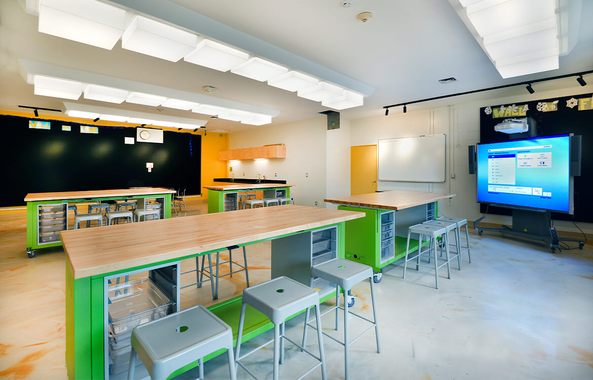 In the art room, DMR took the existing space and added special lighting fixtures, movable and foldable tables with art storage, display cases and a wall-mounted, flexible display system to transform the space into an interactive, engaging art studio and gallery.