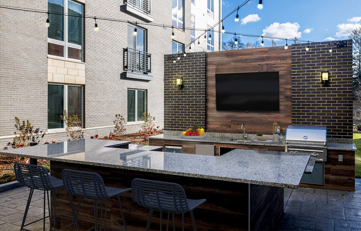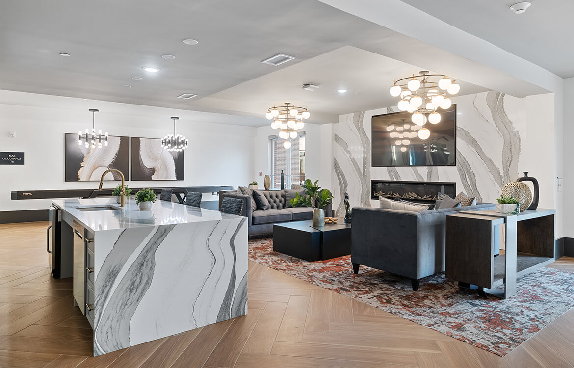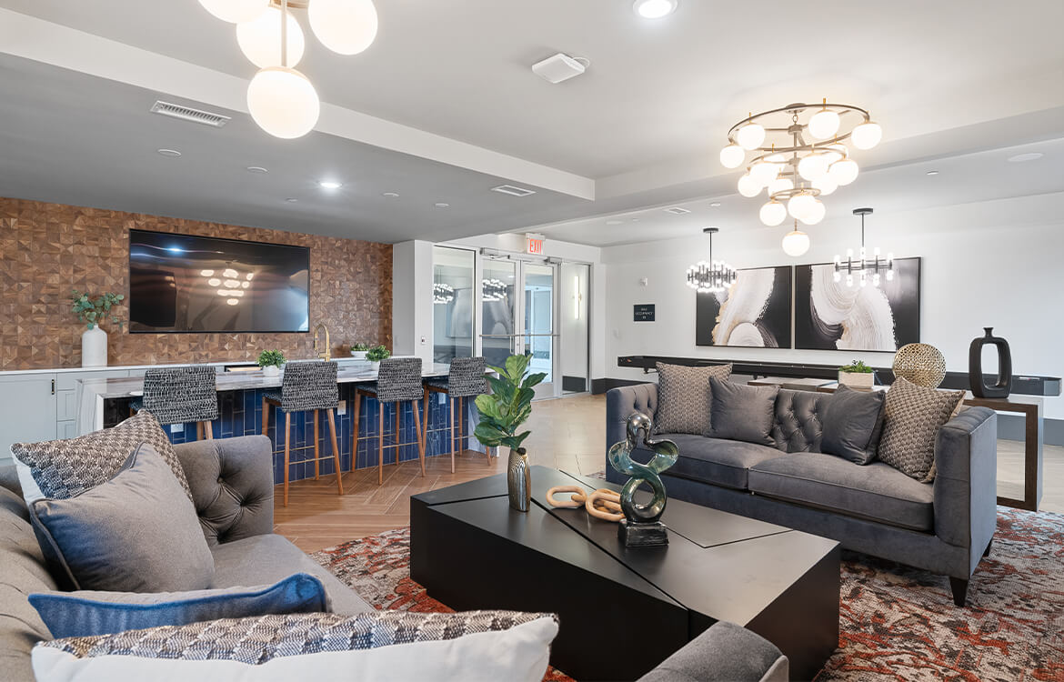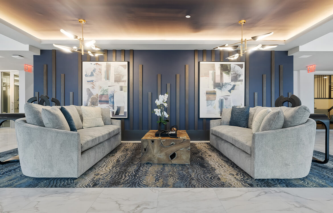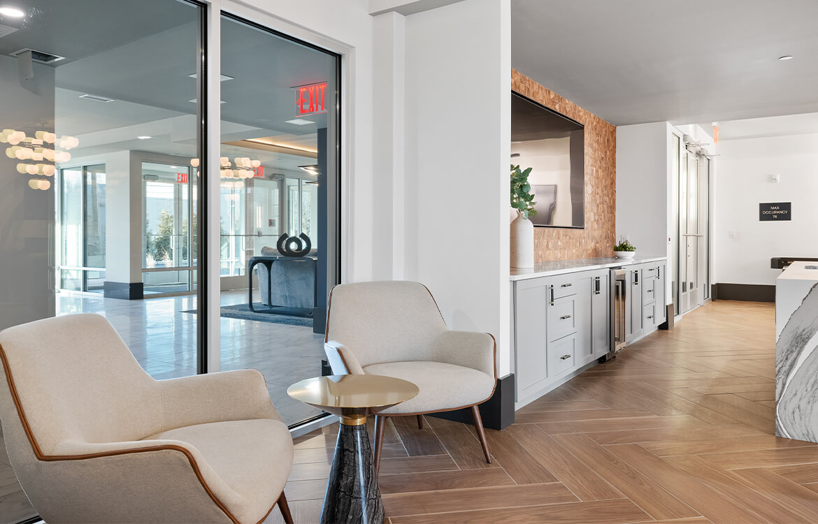 The 105,000 SF building is configured around a 9,500 SF internal courtyard which serves as an amenity and outdoor passive recreation space, including a fireplace, BBQ area, pergola, turf lawn area and multiple seating areas. The interior boasts a large well-appointed lobby with multiple seating and lounge spaces along with an expansive club room that opens directly out to the courtyard.