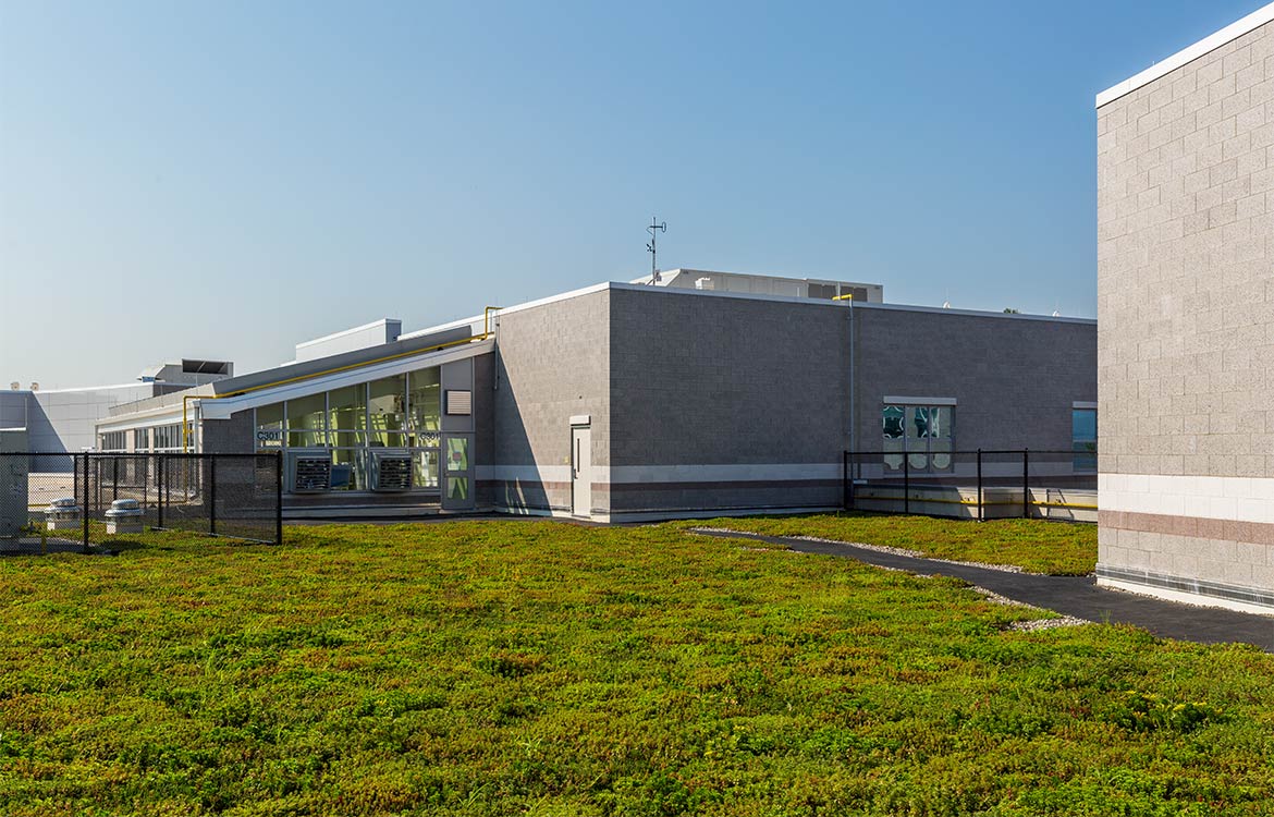 The vocational-technical high school is an icon for sustainability, equipped with wind turbines, geothermal heating, 27,000 square feet of solar panels and 20,000 square feet of green roofs. Beyond theses unrivaled sustainable features, in line with the project-based learning curriculum of the school, a sustainability curriculum was developed surrounding the school’s features. In addition, educational signage throughout the facility, dedicated ecology events throughout the year, a strict commitment to recycling and a green cleaning contract, all contribute to the development of life-long sustainable champions. The project achieved LEED Gold certification.